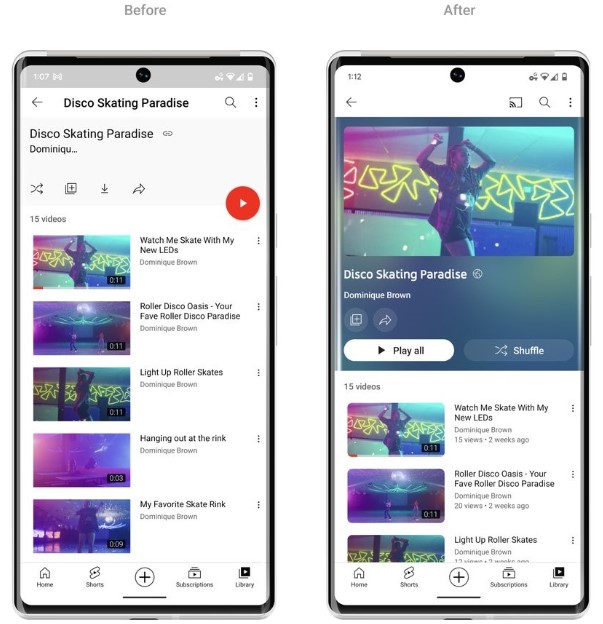 Conform companiei, aplicația a primit acum o temă dinamică, ce aduce culori mai vii în prim plan. Primul clip dintr-un playlist va fi afișat astfel într-un chenar de dimensiuni mai mari, viu colorat. Există și un mod ambiental, zona de jos a clipurilor fiind iluminată acum în mod portrait. E un efect luminos similar cu cel redat de televizoarele Philips Ambilight, disponibil doar pentru cei ce folosesc dark mode pe desktop și mobil.