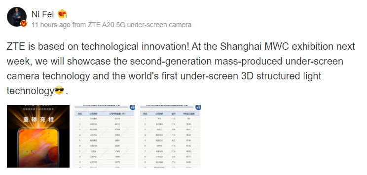 Din câte vedeți în captura de mai sus, Ni Fei a afirmat că noul senzor folosește o tehnologie de “lumină structurată 3D”. Nu știm încă cum ar funcționa aceasta, dar pe lângă fotografii selfie de calitate mai bună, ar urma să fie folosită pentru autentificarea facială. Postarea cuprinde, de asemenea, o imagine în care este prezentat rank-ul patentelor în așteptare din China. Se pare că ZTE ocupă locul 1, fiind compania cu cele mai multe brevete înregistrate.