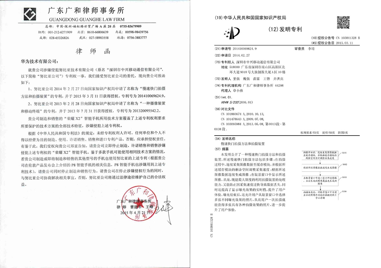 Cele două scrisori prin care ZTE aduce la cunoștiință aceste lucruri celor de la Huawei, au fost postate și pe platforma de socializare Weibo. Reiese faptul că Huawei s-a folosit de două tehnologii ZTE legate de viteza obturatorului și modalitatea de captură. În acest context, ZTE cere companiei rivale oprirea producției pentru modelele MediaPad X2 și P8 până la definitivarea procesului.