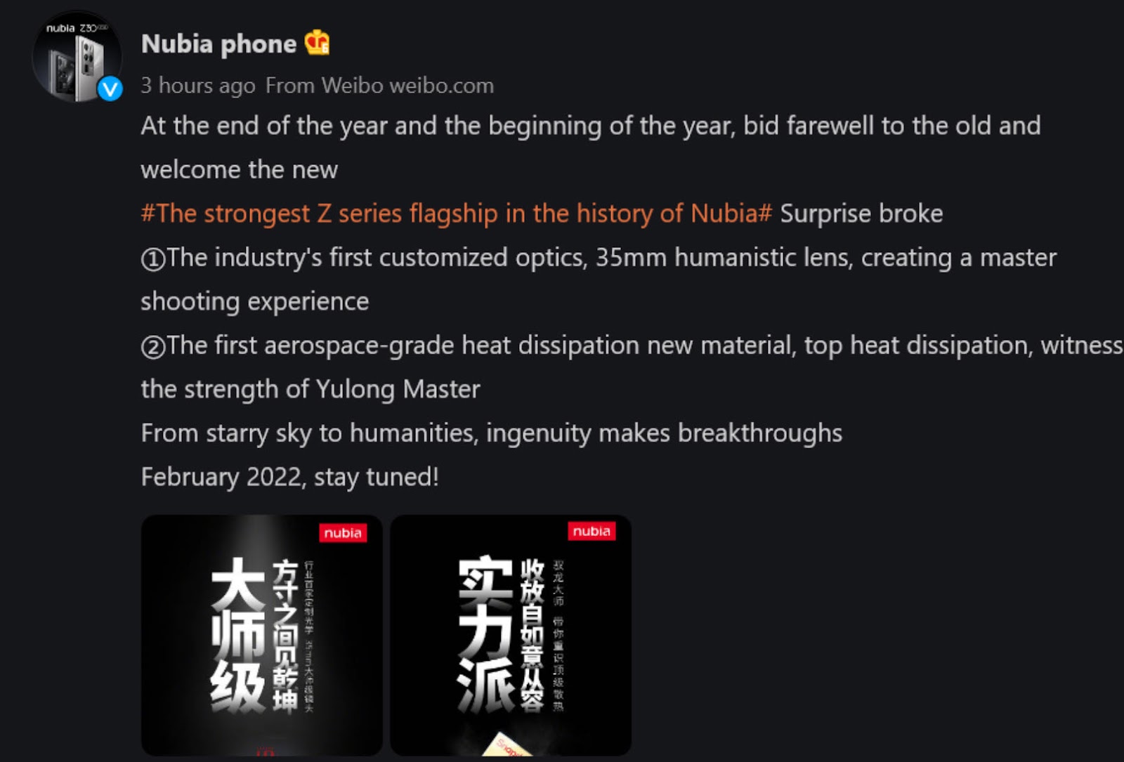 ZTE pregăteşte primul său flagship din 2022, iar ramura sa nubia a postat pe Weibo teasere cu privire la acest telefon, cunoscut ca nubia Z40. Se pare că terminalul va sosi în luna februarie, cu dotări de top. Posibil să apară la MWC 2022.