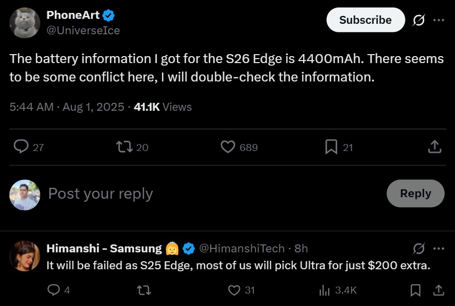 Tipster-ul susține că Galaxy S26 Edge va avea de fapt o baterie de 4400 mAh. Vorbim deci despre un upgrade de 500 mAh fața de versiunea actuală S25 Edge. Un detaliu interesant care circulă în paralel este faptul că Galaxy S26 Edge ar putea fi și mai subțire decât predecesorul său, care deja cobora la doar 5,8 mm grosime. Dacă acest lucru se confirmă, înseamnă că Samsung a reușit să înghesuie o baterie mai mare într-un corp și mai compact, ceea ce nu-i lucru ușor.