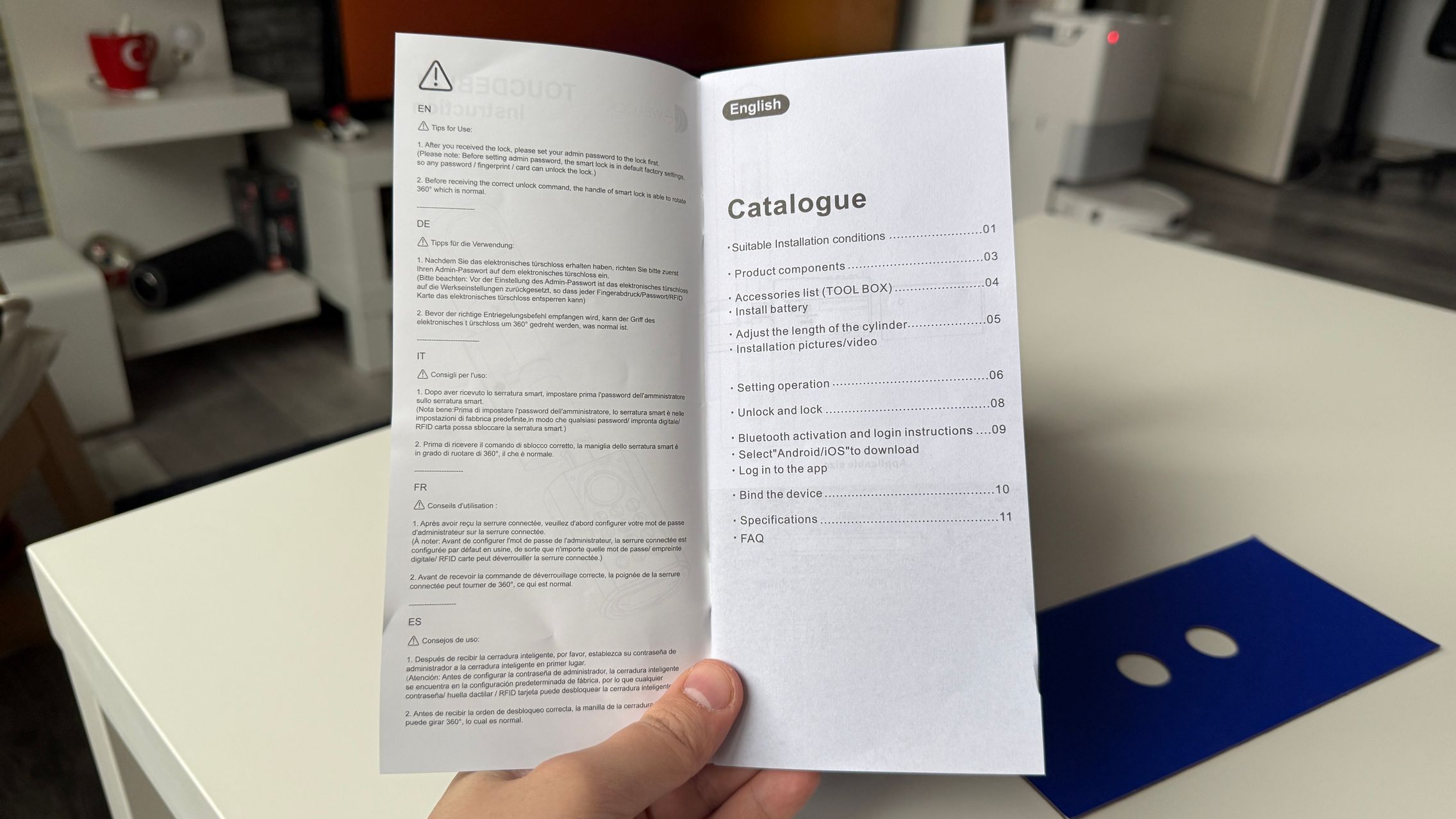 Conținutul pachetului este simplu dar nu lipsește nimic. Am găsit manualul de utilizare care are limba engleză și cu indicații ușor de urmărit pentru o instalare fără probleme. Am aflat cum se ajustează lungimea cilindrului, are poze pentru instalare și am descoperit și cum se operează aplicația. Eram curios și ce se întâmplă dacă bateria este pe sfârșite și cum se deblochează ușa. Am aflat de aici!