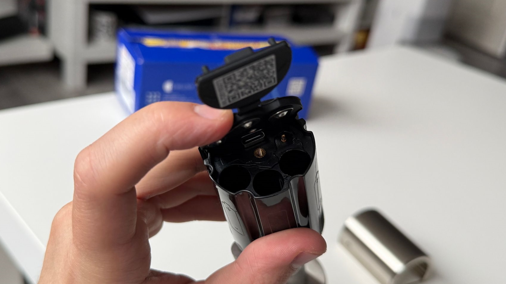 Jos am dat de un cod QR pentru înrolarea în aplicație și sub acest capac din silicon moale am găsit un port USB-C, dar nu e pentru încărcare, este pentru backup pentru deblocare din aplicație atunci când nu mai ai baterie. Și mai jos, sub al doilea capac ai locașul pentru cele 3x baterii AAA de care ai nevoie pentru funcționare.