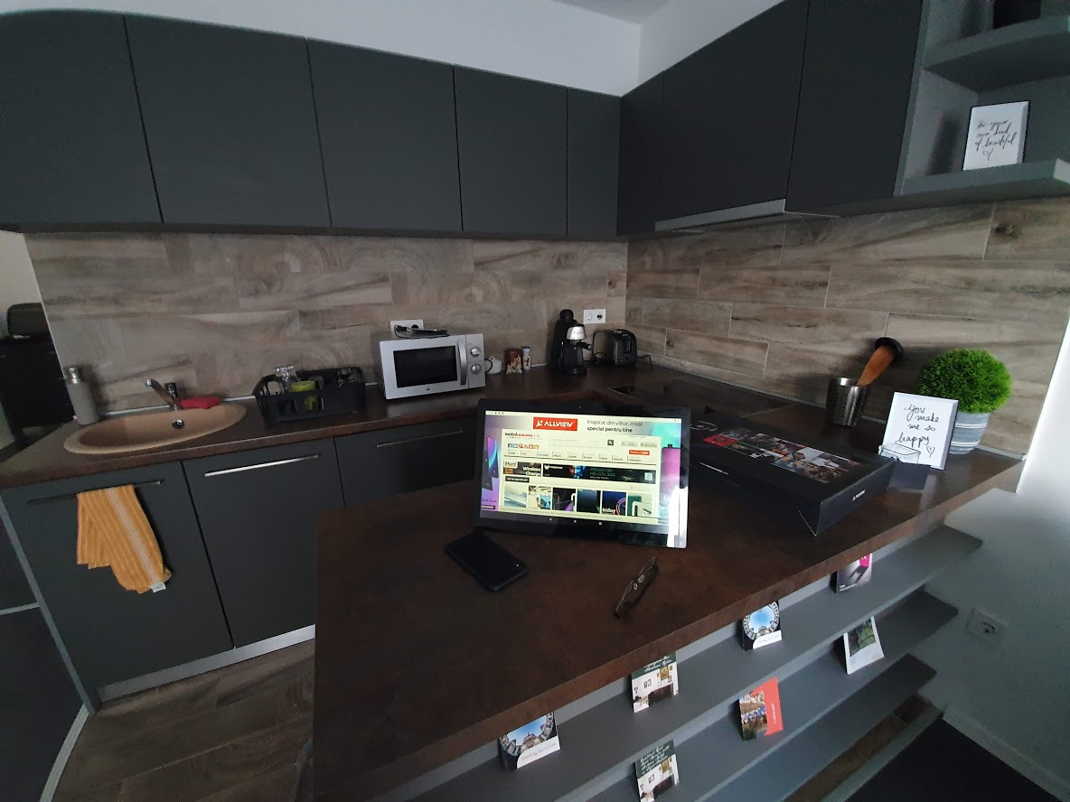 Pentru videoconvorbiri avem o cameră de 2 MP, iar pe partea de conectivitate wireless există Bluetooth 4.0 şi WiFi a/b/g/n. Bateria este o unitate de 5000 mAh Li-Po de 7.6V, iar încărcătorul este unul de 12 V. Pe hârtie avem listată o autonomie de 265 de minute. Allview Viva Home are şi aportul asistentului virtual AVI, dar suportă şi Google Assistant, pentru comenzi vocale când ai mâinile murdare în bucătărie şi găteşti.