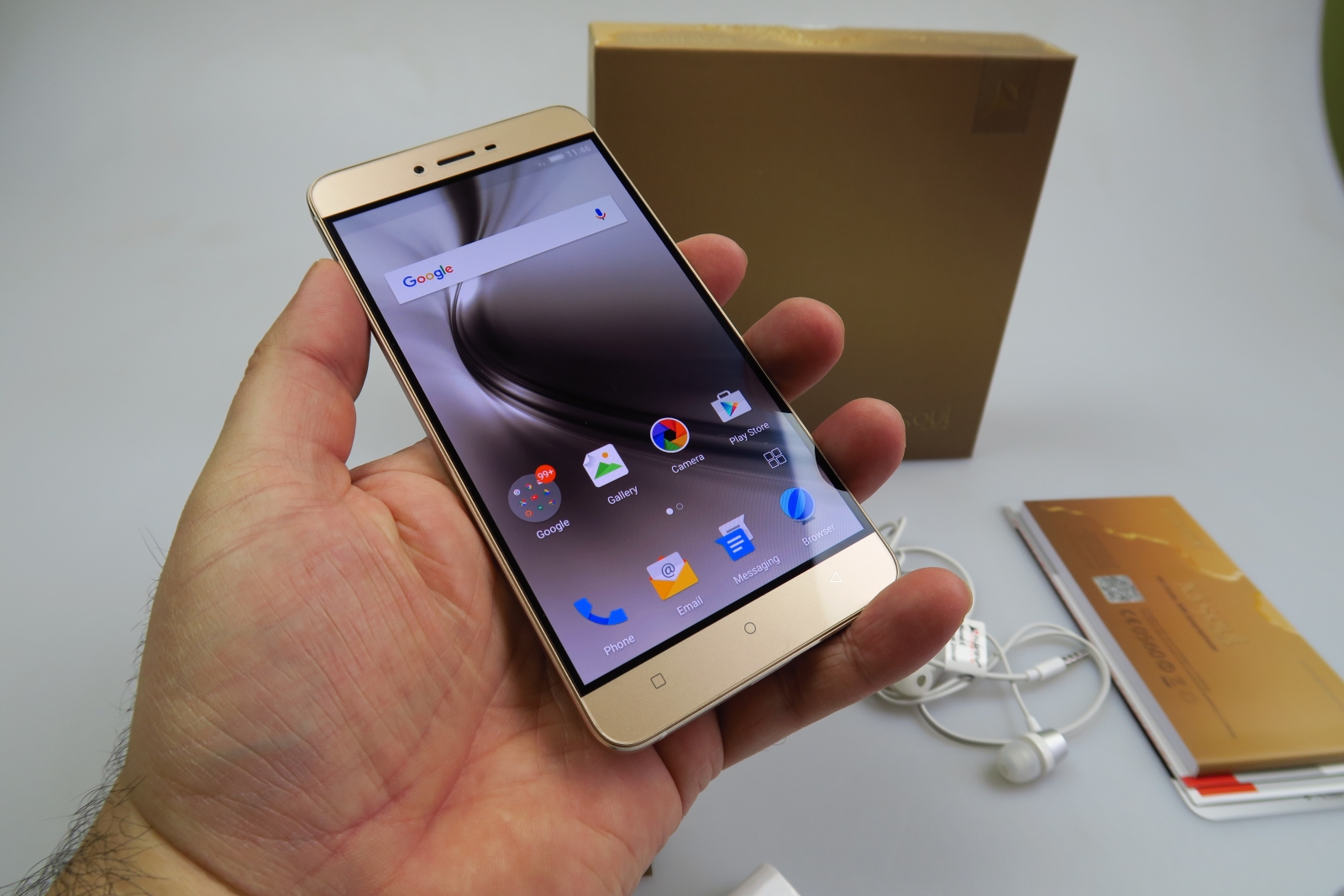 După ce am testat Allview X3 Soul Mini, a sosit la teste şi fratele său mai mare, Allview X3 Soul. Terminalul costă 1499 lei şi se remarcă prin sasiul metalic subţire, cu talie de 6.9 mm, dar şi cutia colorată pe o nuanţă de auriu.