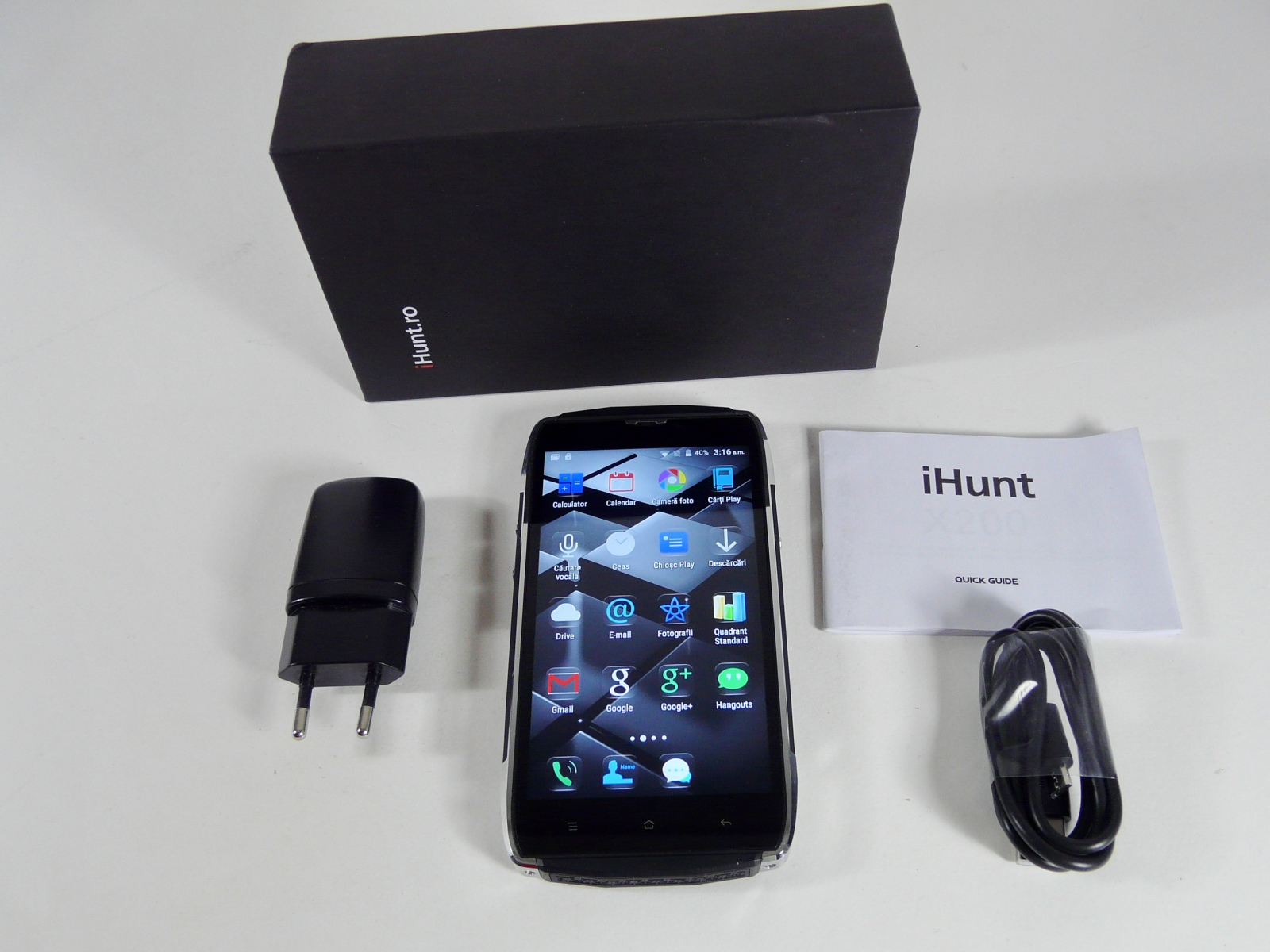 Aflaţi că iHunt este brandul companiei româneşti iHunt Technology şi el activează din 2014. iHunt produce, importă şi distribuie telefoane mobile rugged, smartphone-uri şi produse de vânătoare. Terminalul vine cu încărcător, cablu USB şi manual în cutie, deci fără căşti. Avem de-a face aici cu un smartphone cu ecran HD de 5 inch, cu panou produs de LG, iar la bord se afla şi 2 GB RAM şi procesor quad core MediaTek de 1 GHz.