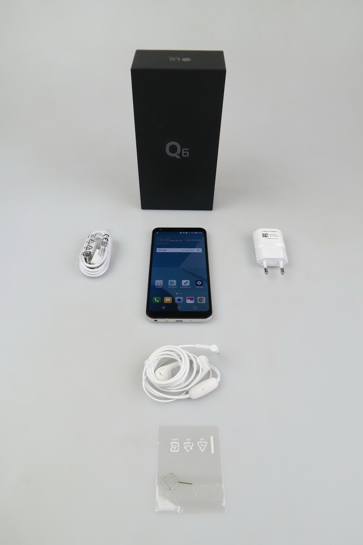 Terminalul vine la pachet cu un încărcător, cablu USB (microUSB 2.0), cheiţa metalică pentru accesarea slot-urilor şi o pereche de căşti. Varianta comercială ar trebui să aducă şi un manual. Ecranul Full Vision arată spectaculos şi telefonul este foarte compact pentru un model cu diagonală de 5.5 inch. Oferă un aspect 18:9 şi o rezoluţie Full HD+. LG Q6 măsoară 8.1 mm în grosime, cântăreşte 149 grame şi are un corp metalic solid, fabricat din aluminiu Seria 7000.