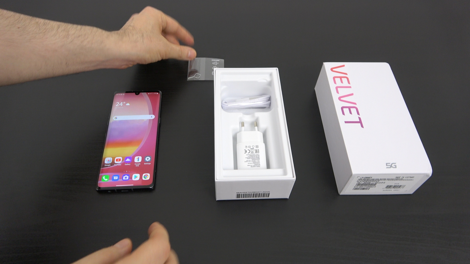 Ceea ce avem noi aici nu este cutia comercială, ci cea asociată variantei de test. Cea comercială va include în pachet manual, cheiţa SIM, încărcător, cablu USB-C, husa silicon. Telefonul va veni cu folie de protecţie deja montată.