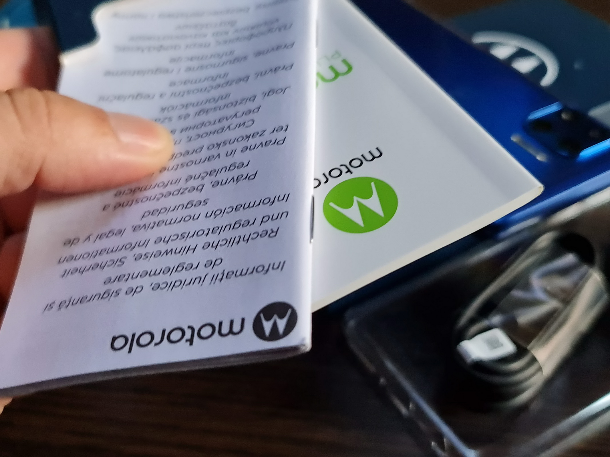 În general primim doar cutia telefonului şi atât, eventual vreun press kit, cu huse, manuale extra şi alte briz-briz-uri. Ei bine, Moto G 5G Plus ne-a sosit într-o canistră militarăverzuie, din aceea pe care o pui pe vehiculul militar, ca un Humvee. La interior ecrau lucruri mai "civile" totuşi, precum jeleuri, ciorapi cu imprimeu Motorola şi un cartonaş cu detalii despre telefon. Cutia în sine e fix de mărimea uneia de telefon Moto G, este albastră şi are imprimeu alb cu verde.