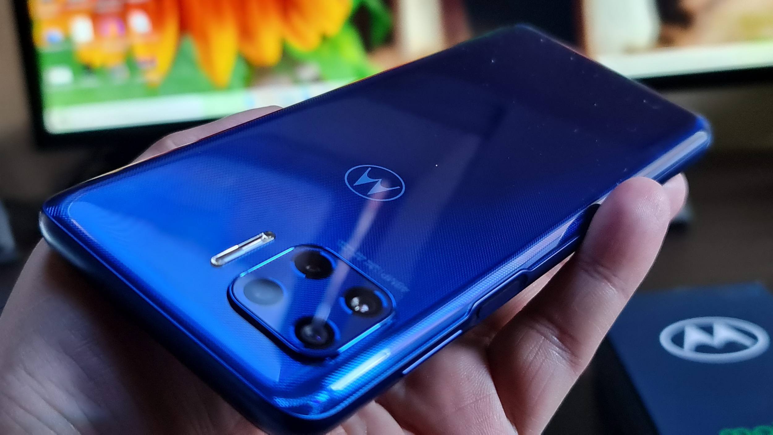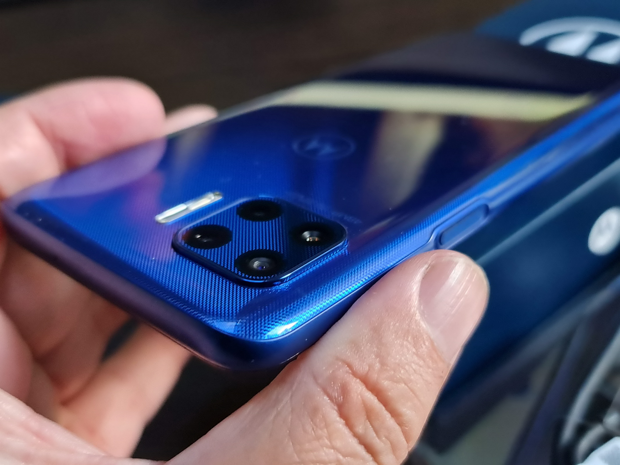 Moto G 5G Plus e găseşte doar pe albastru, o nuanţă numită oficial Surfing Blue şi care are o textură punctată în spate ce face materialul să semene cu denimul de jeanşi. Remarc muchii un pic mai groase aici decât e trendy la ora actuală, clar mai groase decât la Moto Edge, dar şi o simetrie a faţadei, puţin stricată de camera selfie duală decupată în ecran. Vestea bună e că fiecare senzor e decupat individual, nu avem o pilulă inestetică precm la Galaxy S10+, Huawei P40 Pro, într-o mică măsură şi OnePlus Nord.