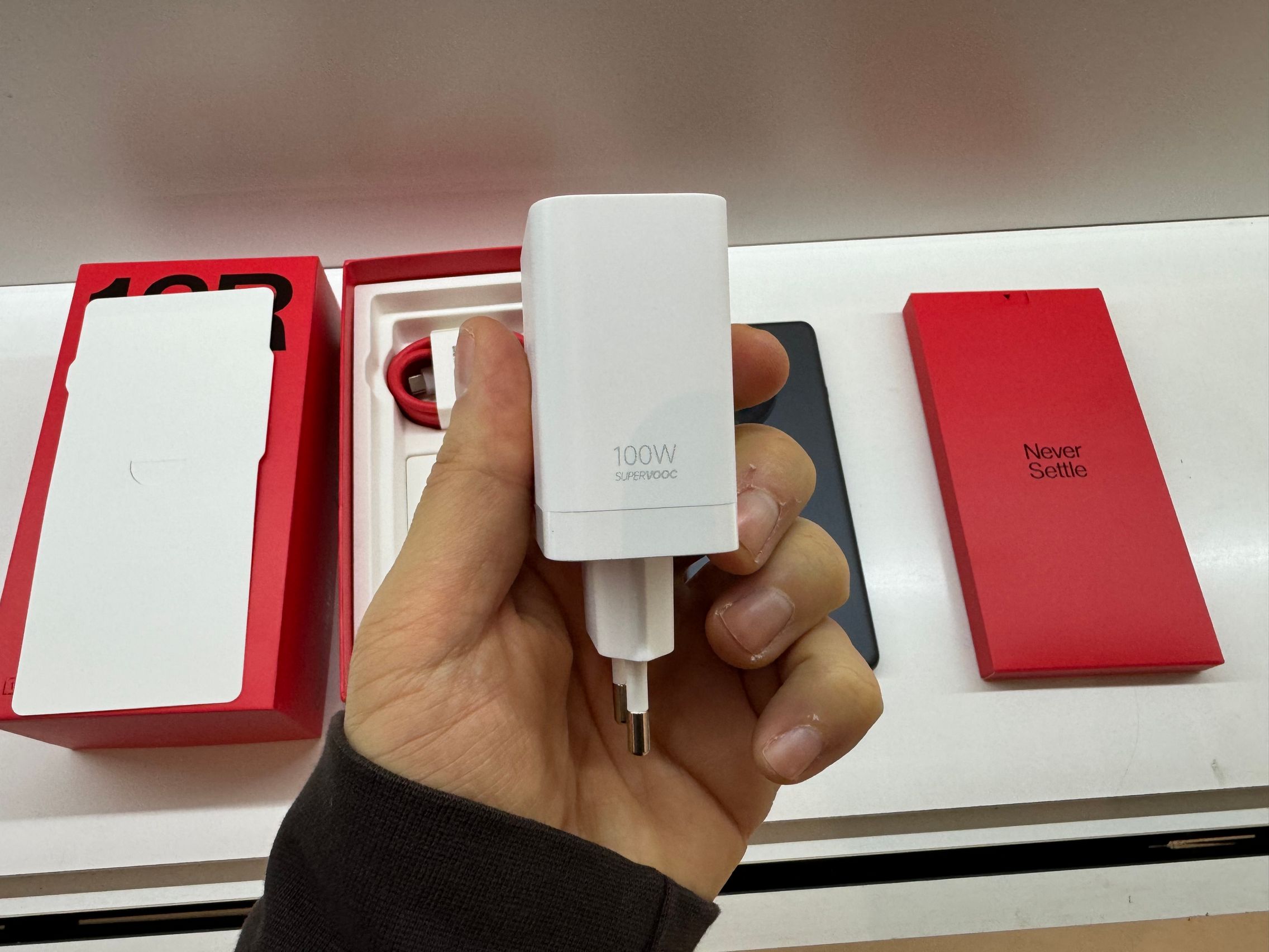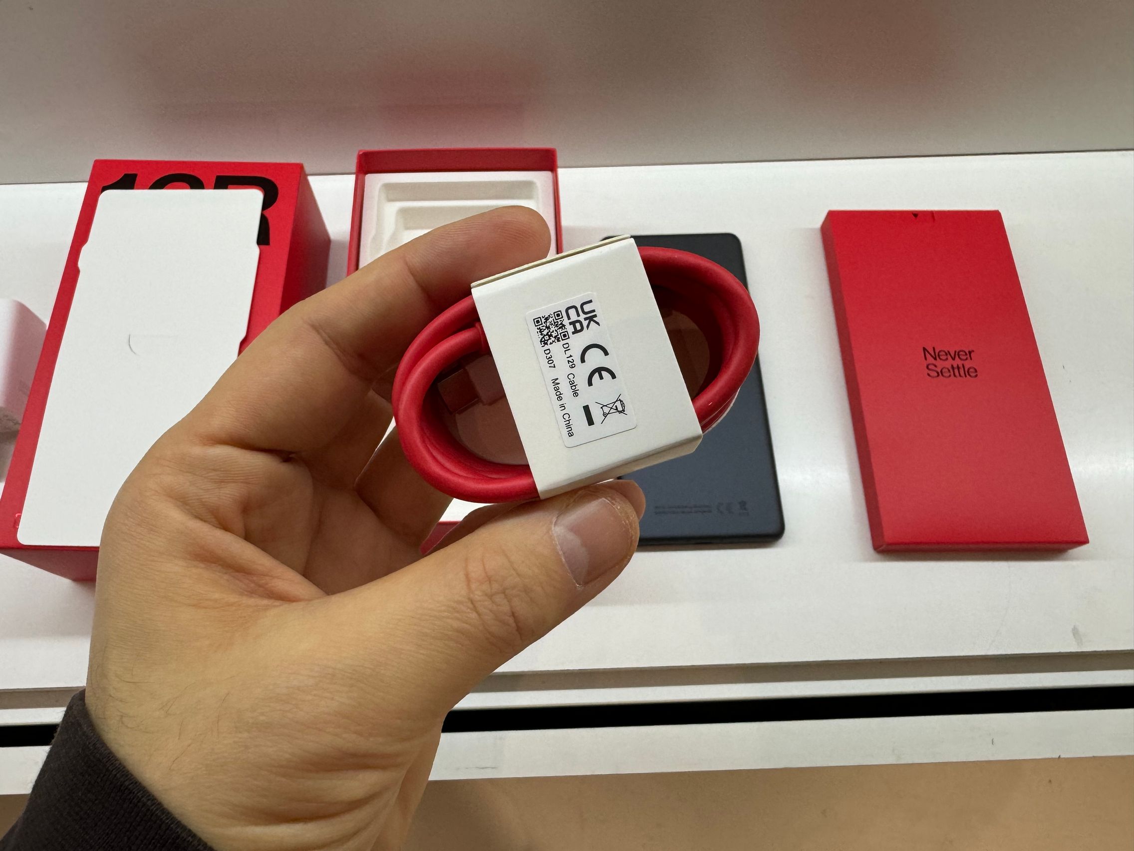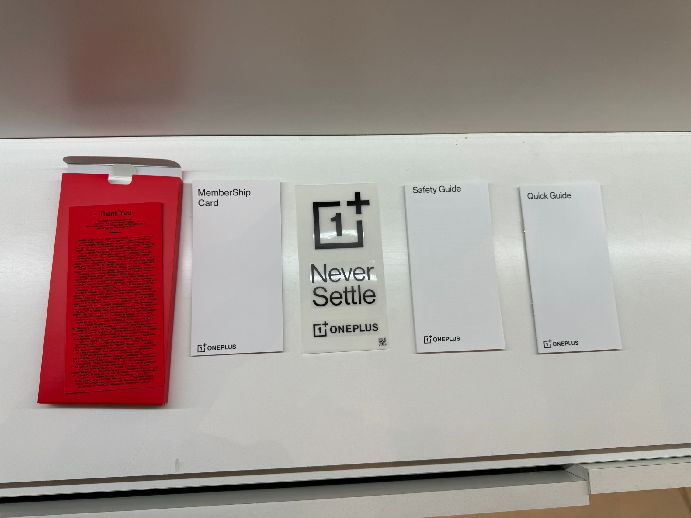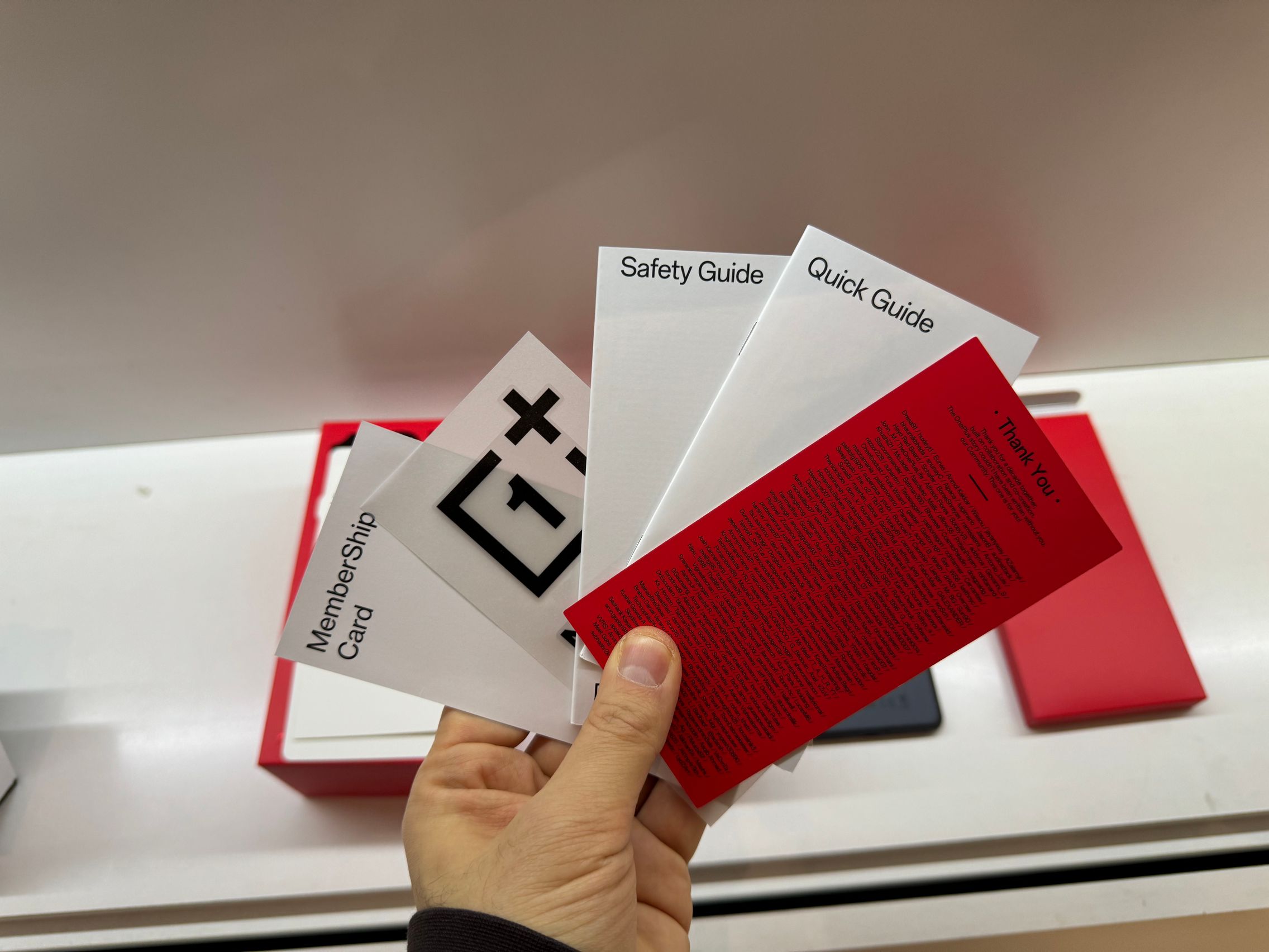 În cutie găsim un încărcător SuperVOOC de 100W, fix cum avem şi la OnePlus 12, un cablu USB-C la USB-A, evident roşu, dar şi manual, cheiţa SIM, stickere, card special cu cod QR bonus pentru membri, mesaj de la fondatorul OnePlu şi un Safety Guide. Evident am citit şi valoarea SAR, cum tot facem de la o vreme.