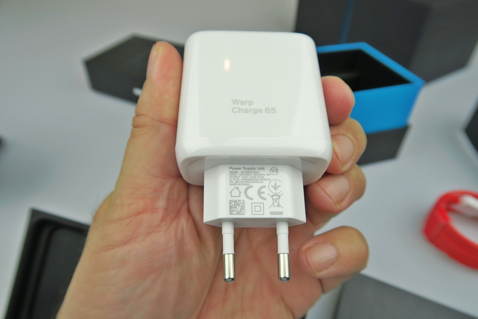Noi avem cutia pentru presă, care include 3 huse, una cu model urban şi cu dotările cheie ale telefonului, una cu degrade de la albastru la portocaliu, dar şi una neagră, mai sobră. În cutia propriu zisă, cea accesibilă cumpărătorului de rând găsim un încărcător de 65W cu conector USB-A, un cablu roşu de la USB-A la USB-C, dar şi o husă transparentă, un manual, mesaj de la OnePlus şi o cheiţă SIM.
