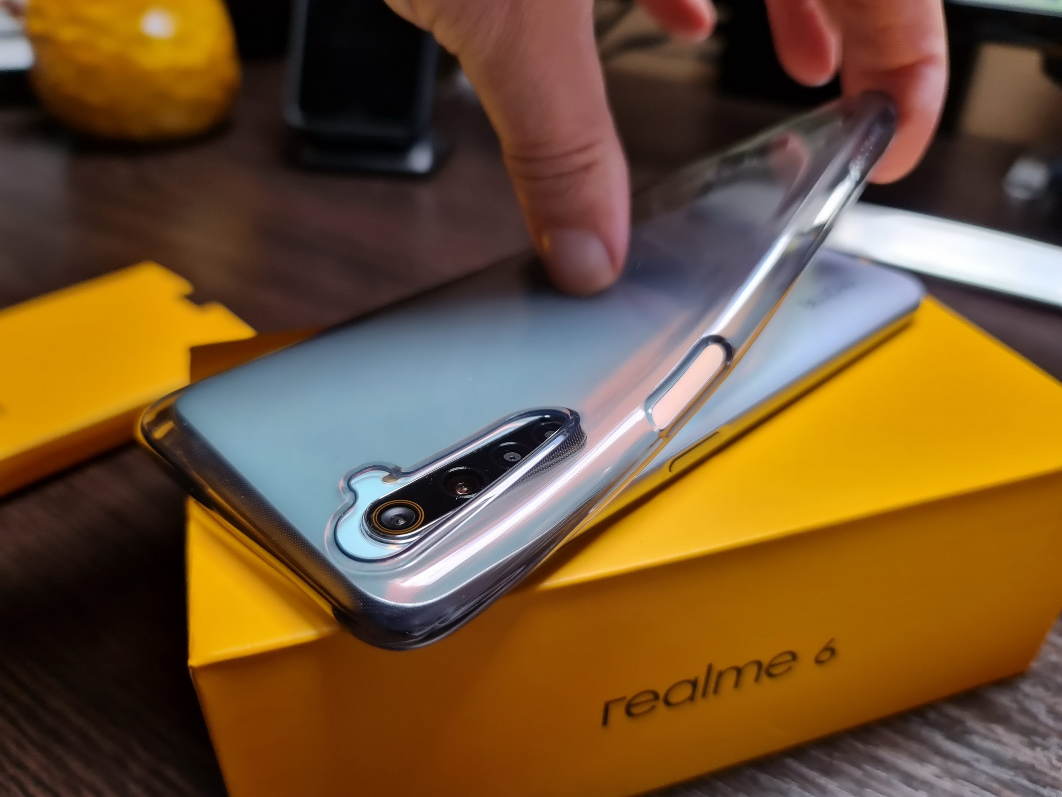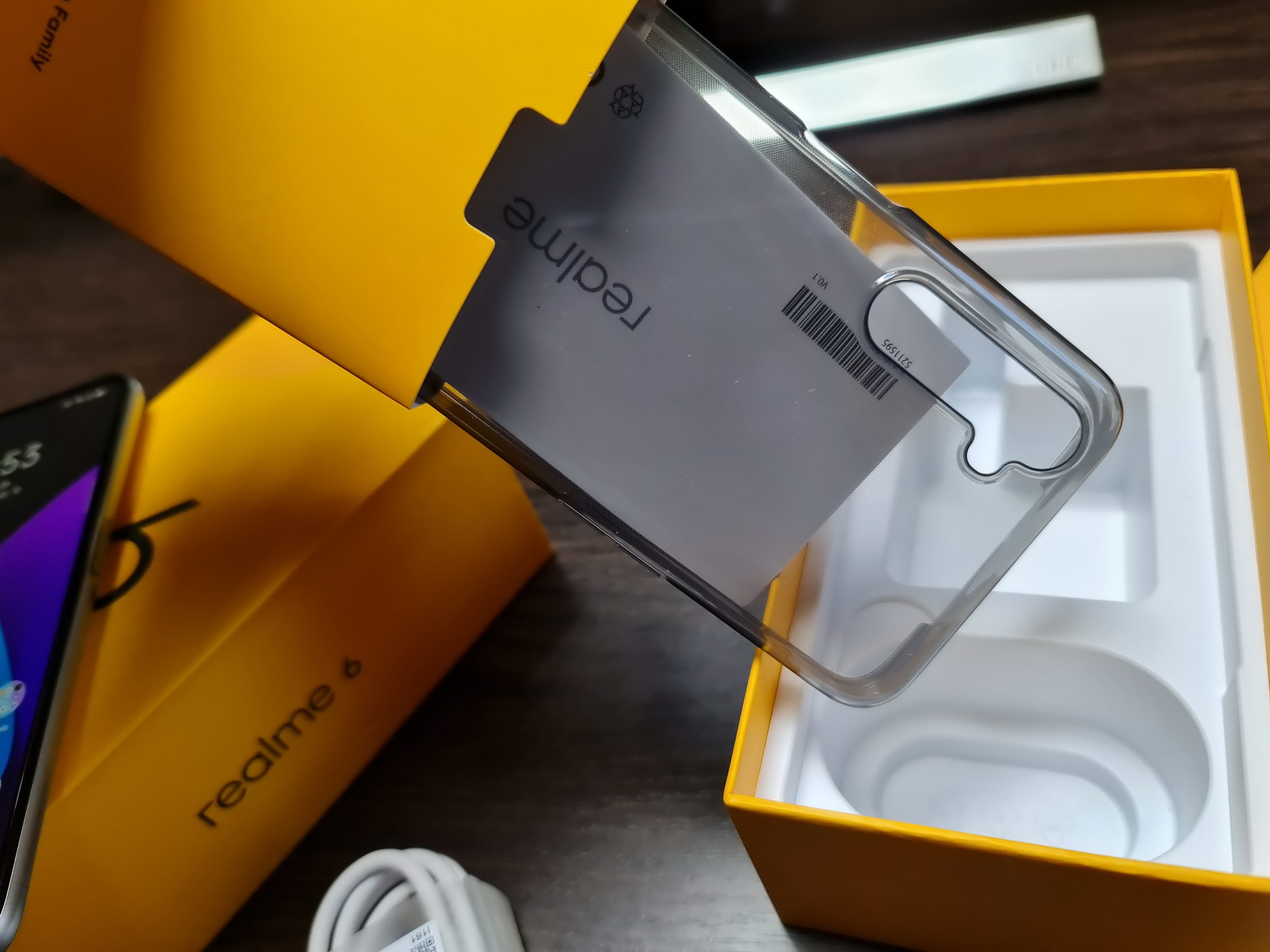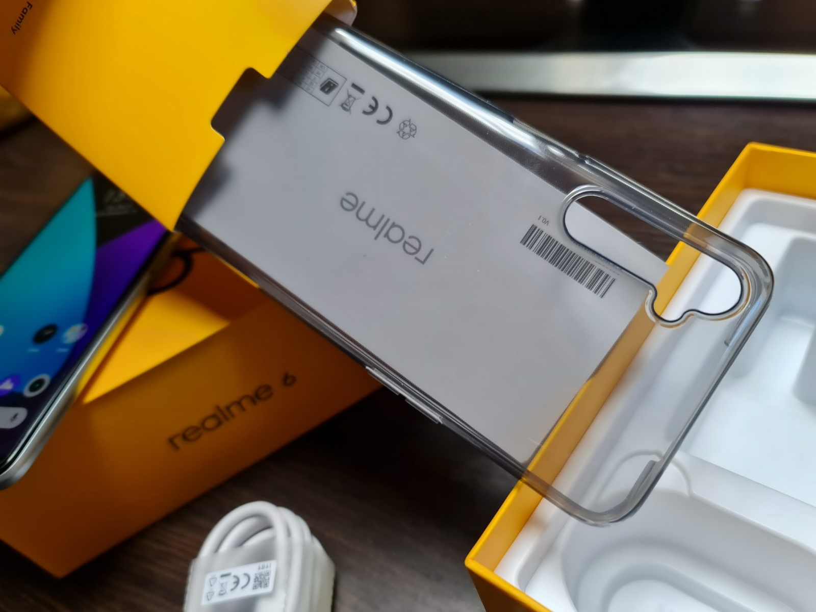 Este un soi de alb perlat cu "ape" albastre şi o formă de litera "V" pe spate. În cutie găsim încărcătorul de 30W cu tehnologie VOOC, împrumutată de la Oppo (are dimensiuni destul de mari aş zice), dar şi un cablu USB-C la USB-A, o husă din silicon, cheiţa metalică pentru acces la sloturi şi manual. Avem şi o protecţie din plastic aplicată din fabrică pe ecran. Realme 6 măsoară 8.9 mm în talie şi cântăreşte 191 de grame. Se simte destul de greu în mâna la prima atingere, dar aderenta pare OK.
