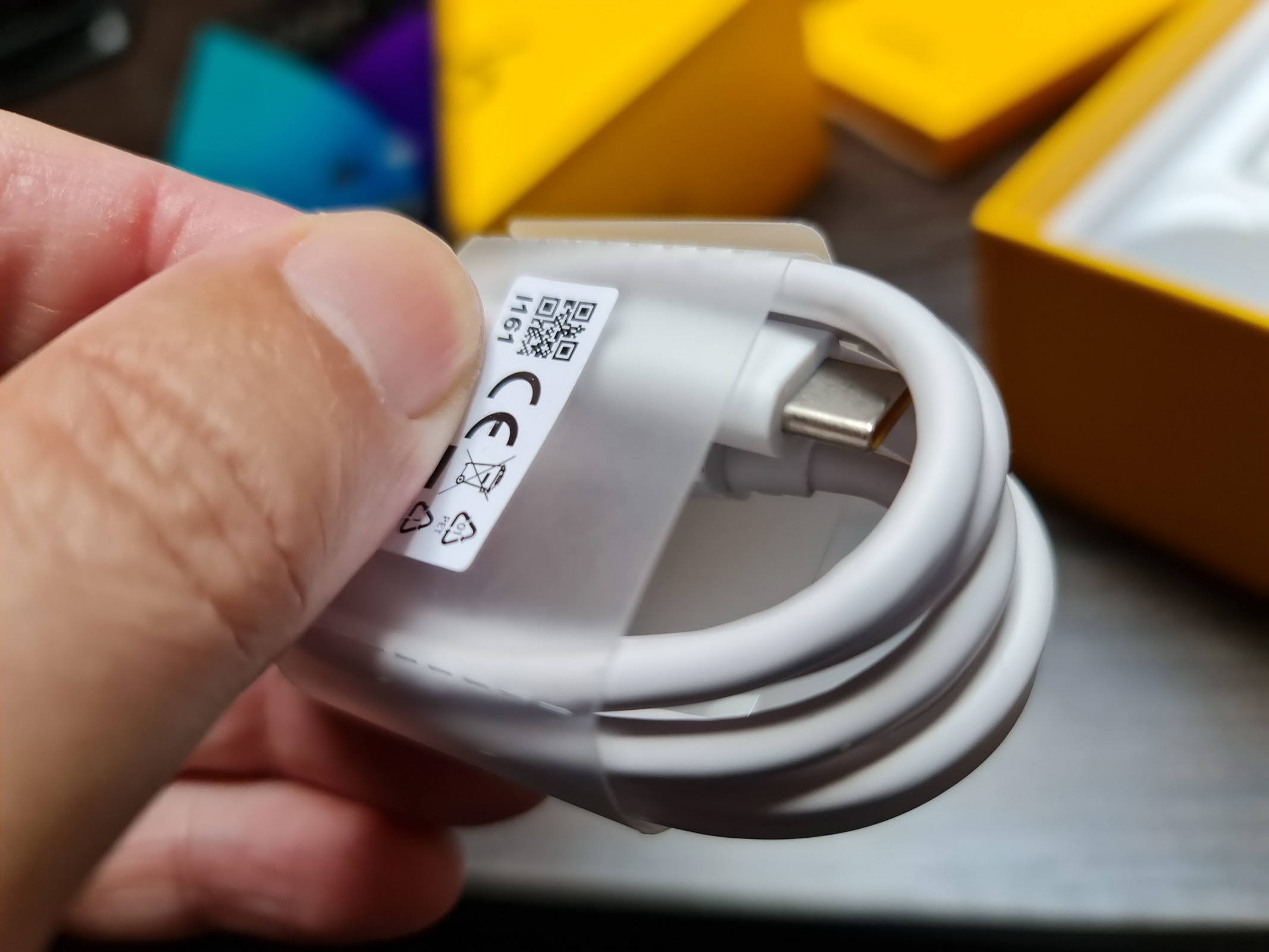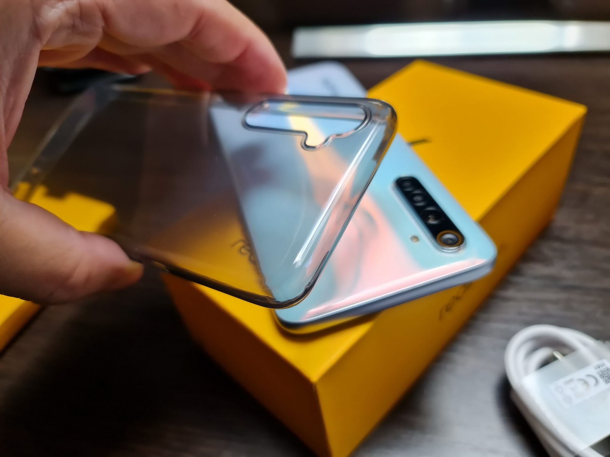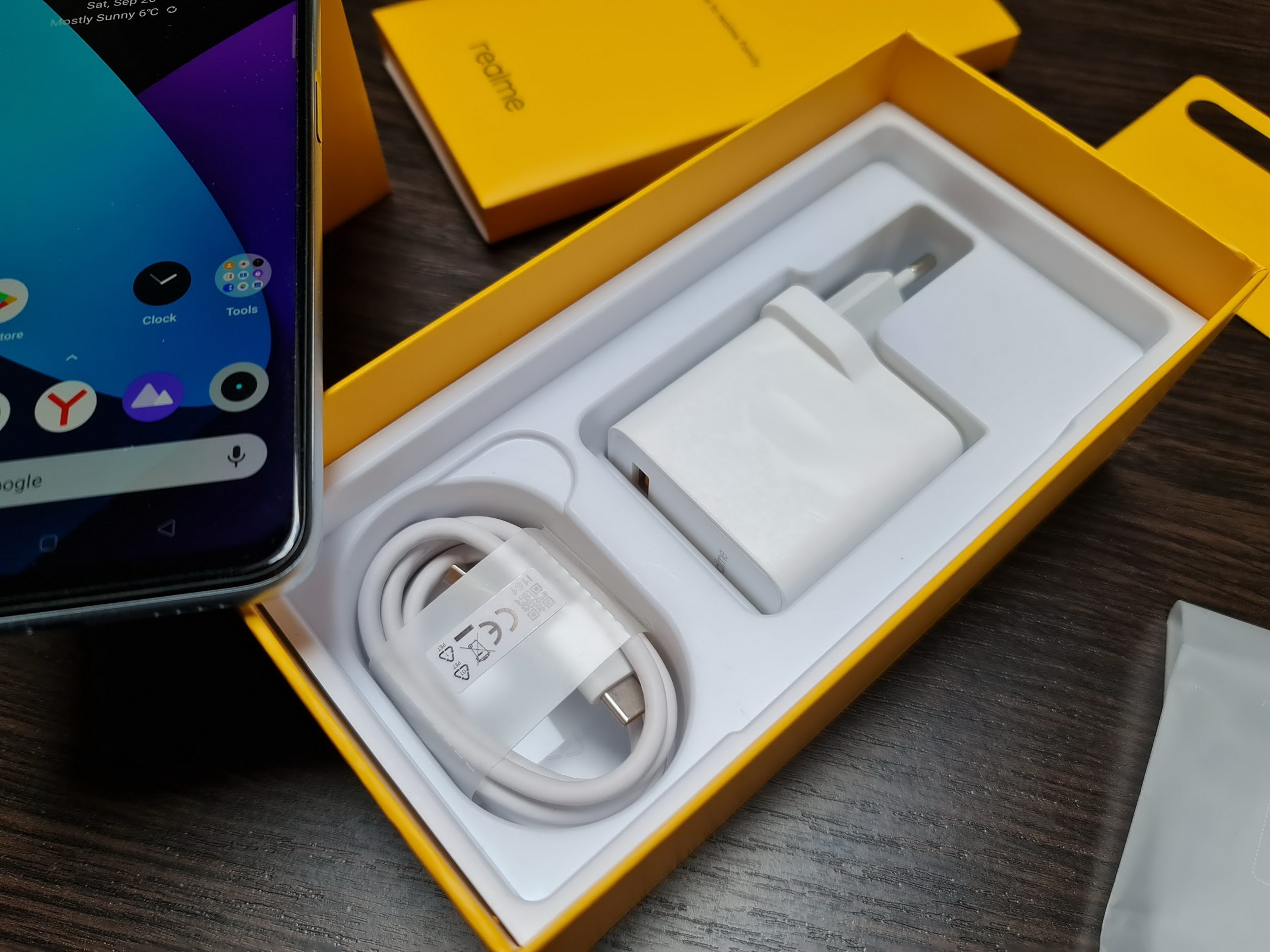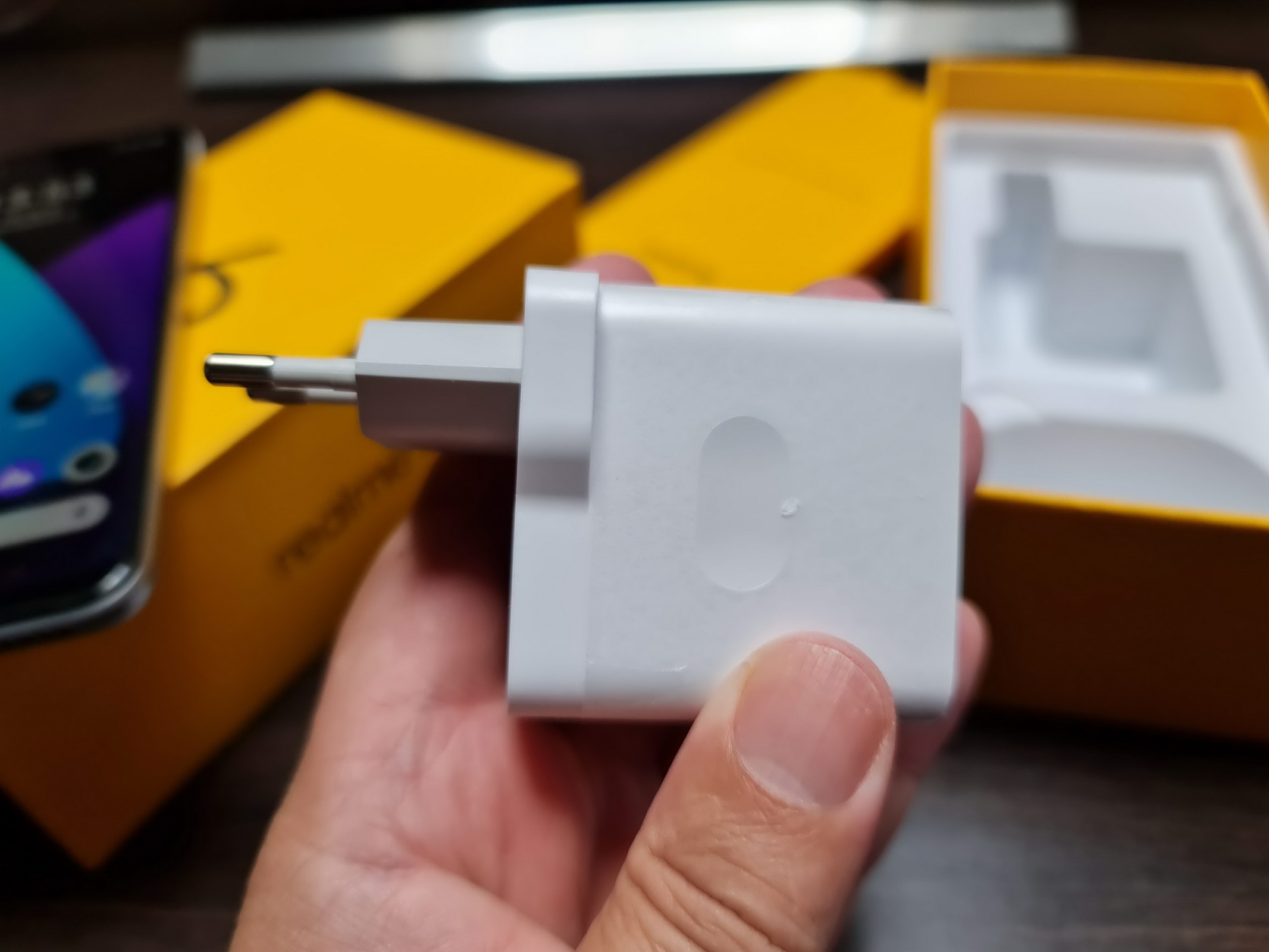 Este un soi de alb perlat cu "ape" albastre şi o formă de litera "V" pe spate. În cutie găsim încărcătorul de 30W cu tehnologie VOOC, împrumutată de la Oppo (are dimensiuni destul de mari aş zice), dar şi un cablu USB-C la USB-A, o husă din silicon, cheiţa metalică pentru acces la sloturi şi manual. Avem şi o protecţie din plastic aplicată din fabrică pe ecran. Realme 6 măsoară 8.9 mm în talie şi cântăreşte 191 de grame. Se simte destul de greu în mâna la prima atingere, dar aderenta pare OK.