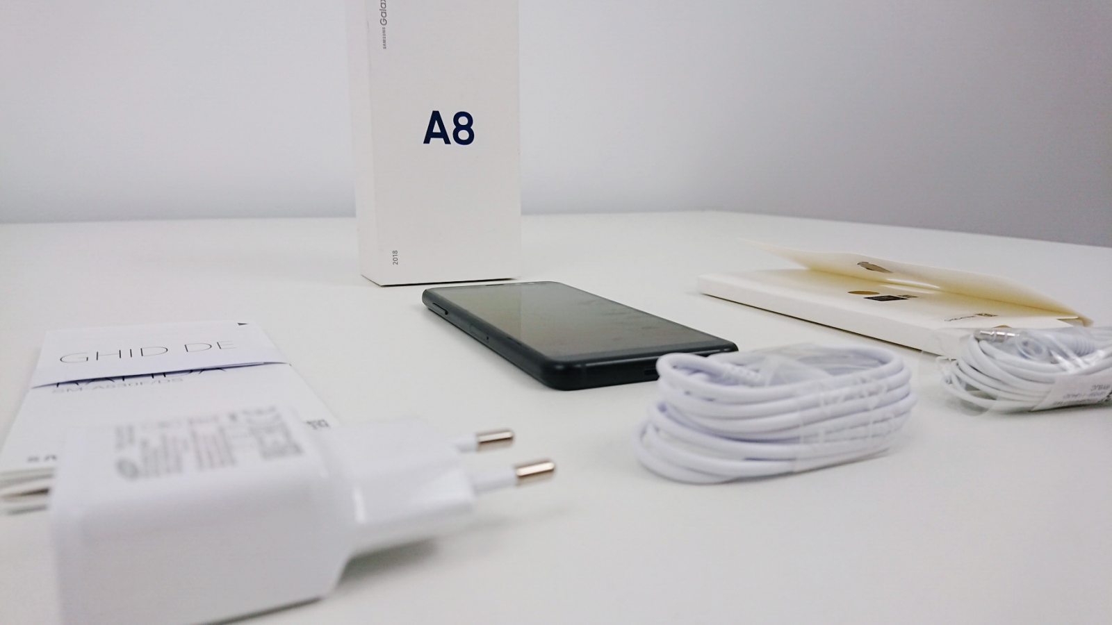 În cutie găsim încărcătorul, care promite alimentare rapidă, cheiţa pentru slot-uri, căşti în stil clasic Galaxy A (sau Galaxy S5 de ce nu), cablul USB Type-C şi manualul. Telefonul are ecran de 5.6 inch cu panou Super AMOLED şi rezoluţie de 2220 x 1080 pixeli şi după cum am spus şi la hands-on, pare a fi un display foarte luminos. Galaxy A8 (2018) este certificat IP68, deci poate fi scufundat în apă la o adâncime de 1.5 metri timp de jumătate de oră fără probleme.