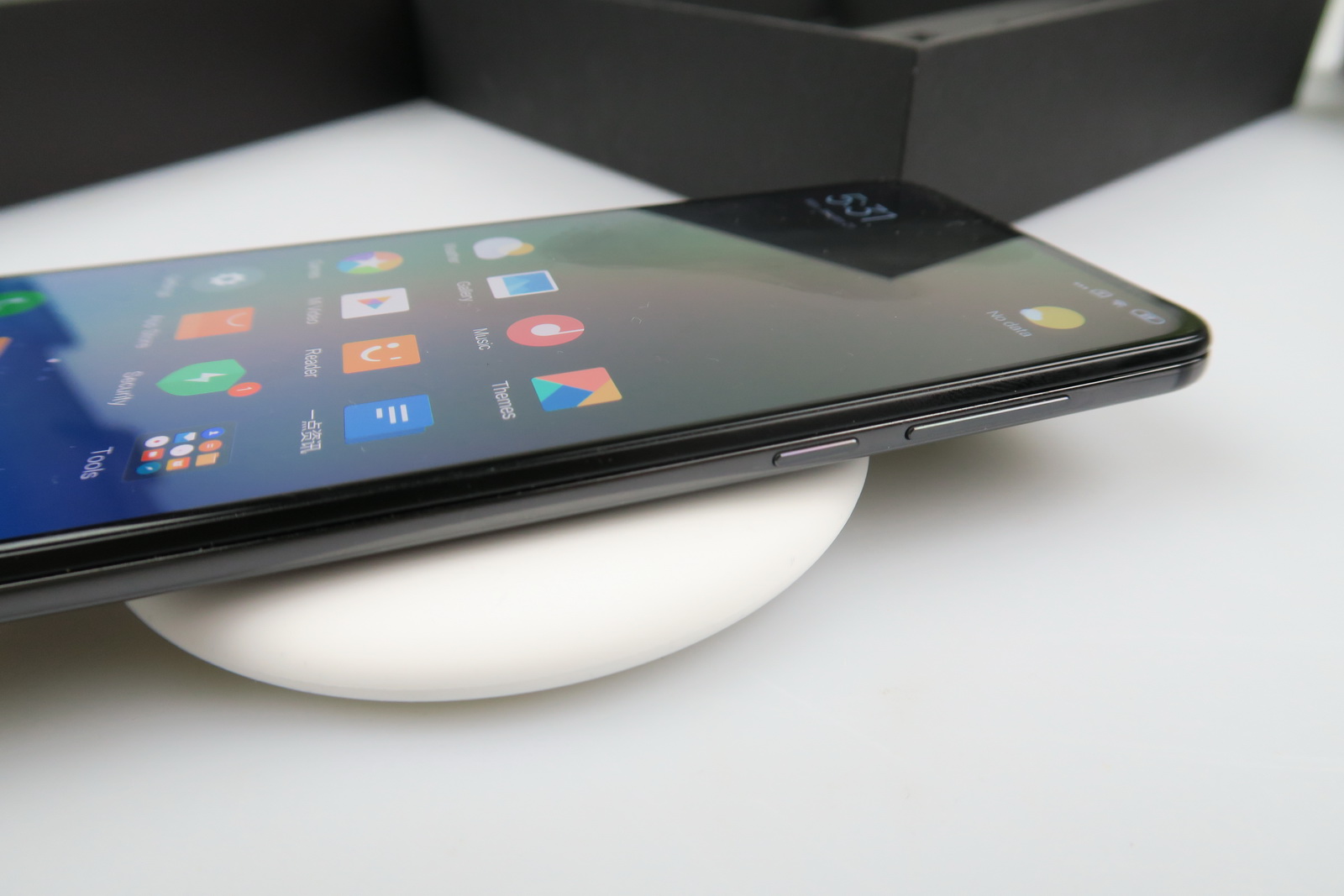 În cutie se află încărcătorul (are nevoie de adaptor la noi), cablul USB Type-C, cheiţa metalică pentru accesarea slot-urilor, o husă, manuale, adaptor USB Type-C către 3.5 mm şi surpriză, un încărcător wireless în formă de biscuite, macaron sau OZN. Multe companii îţi iau zeci bune dolari pe aşa ceva. Telefonul în sine mi-a lăsat o primă impresie de device greoi şi masiv, la 218 grame.