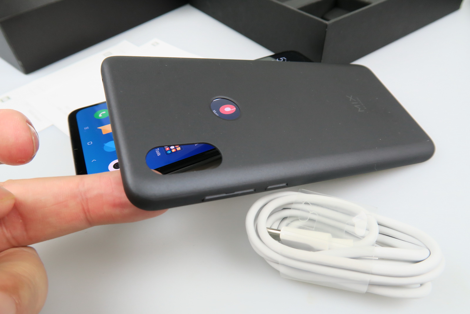 Altminteri telefonul se găseşte la PCGarage.ro, unde costă 2.899 lei şi la Quickmobile.ro, unde are preţul de 2.440 lei (cupon -3%: QUICK202). Slider-ul a debutat în noiembrie 2018 şi vine destul de rapid după ce am scos din cutie un Xiaomi Mi Mix 2S. Cutia seamănă cu ambalajul acelui telefon, fiind destul de mare şi neagră, cu dedicaţie de la fondatorul companiei, Lei Jun, la interior.
